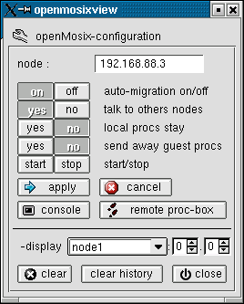 The openMosix-configuration of each host can be changed easily now. All commands will be executed per "rsh" or "ssh" on the remote hosts (even on the local node) so "root" has to "rsh" (or "ssh") to each host in the cluster without prompting for a password (it is well described in a Beowulf documentation or on the HOWTO on this page how to configure it).